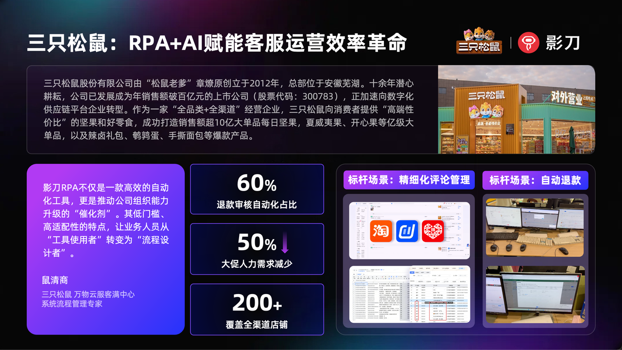 作为中国第一家定位于纯互联网食品品牌的企业,三只松鼠通过与影刀RPA的深度合作,成功推动客服、财务、技术等多部门的数字化转型。面对多平台、多店铺运营带来的重复性工作挑战,三只松鼠借助影刀RPA实现了退款审核、评价处理等核心业务的自动化,显著提升了运营效率。目前,RPA已在大促期间承担约60%的退款审核业务工作量,退款审核团队人员需求减少50%,同时评价处理团队人力成本缩减约67%,真正实现了“全员提效、全员创新”的组织能力升级。