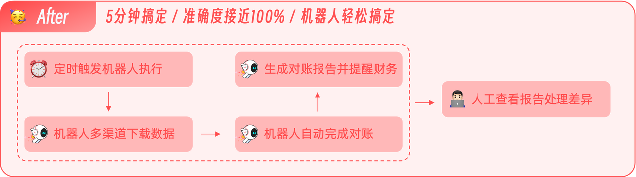 财务对账这个工作场景本来就是一件非常麻烦的事情,电商行业的财务对账更是地狱难度,因为涉及非常多不同系统的财务数据。巨子生物每个月定期,需要把自己的财务系统的财务数据和ERP的财务数据进行比对,确保数据一致性,以前人工对比需要一个专人花两三天时间处理,效率非常低,而且还可能出错,如果当月数据量大,甚至还处理不完,财务人员苦不堪言。