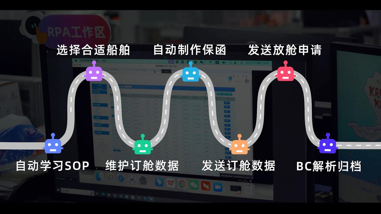 RPA可以自动从客户的订单信息中提取必要的数据,根据航线和船舶情况进行智能选择,自动生成保函并向对应船公司申请放舱,同时24小时监控放舱状态并及时发送催舱邮件,完成全流程订舱自动化。每个环节都不再需要人工参与,原本陆陆续续要消耗一天的工作时间,现在只需要做不定时的核查。