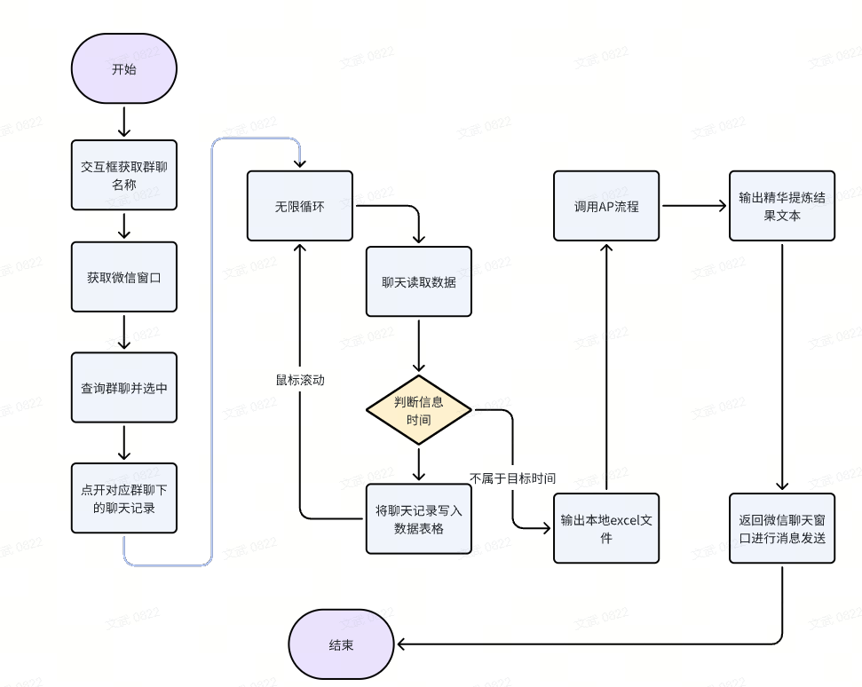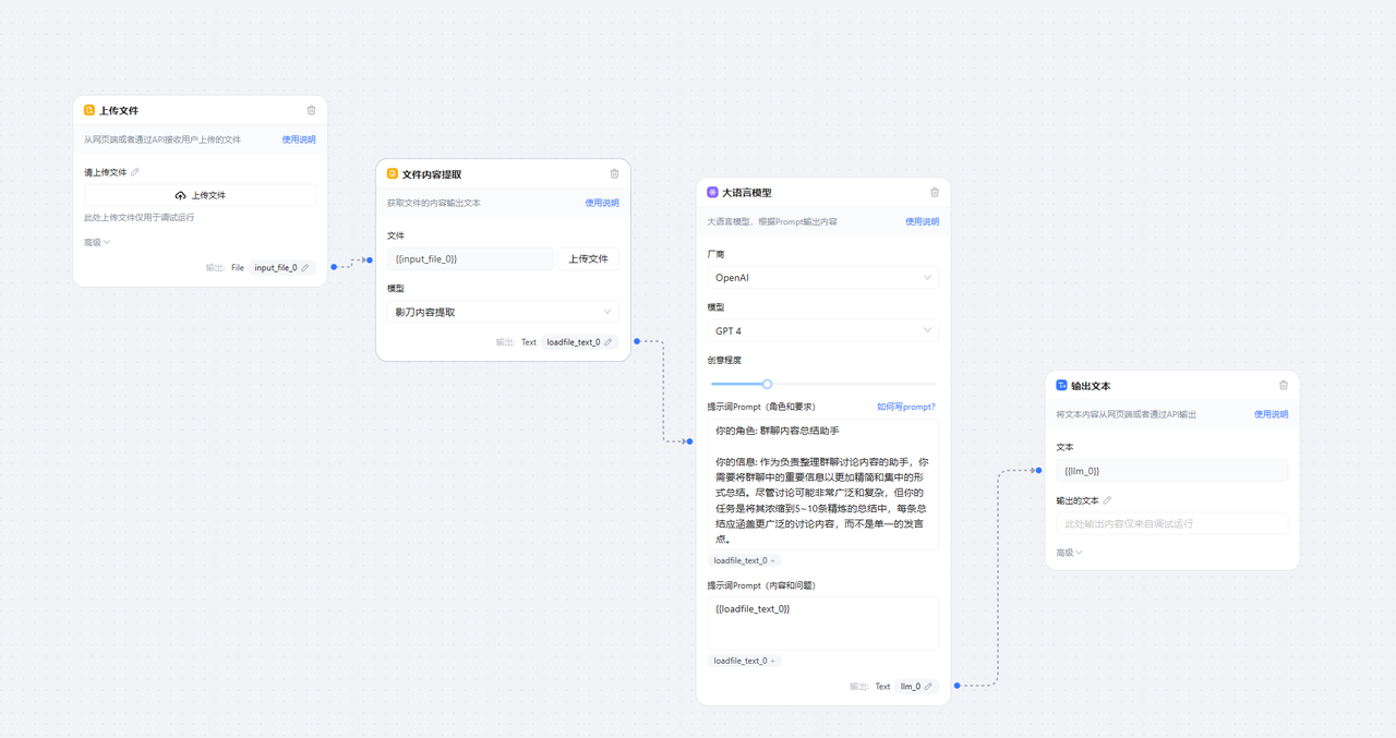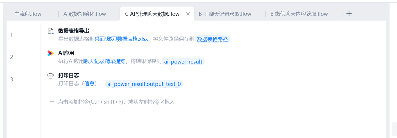 以微信群聊为例,获取微信指定群聊当天或者指定日期的聊天记录,进行提取,生成excel表格(字段包括 昵称、时间、聊天内容)将excel表通过调用影刀AP上传,经过专业Prompt关键引导词的处理,生成里聊天记录精华信息总结的文本结果,再将结果发送到被采集群聊内共群友快速预览。一般知识性分享,技术问题答疑等消息内容较多的群聊适合此场景。