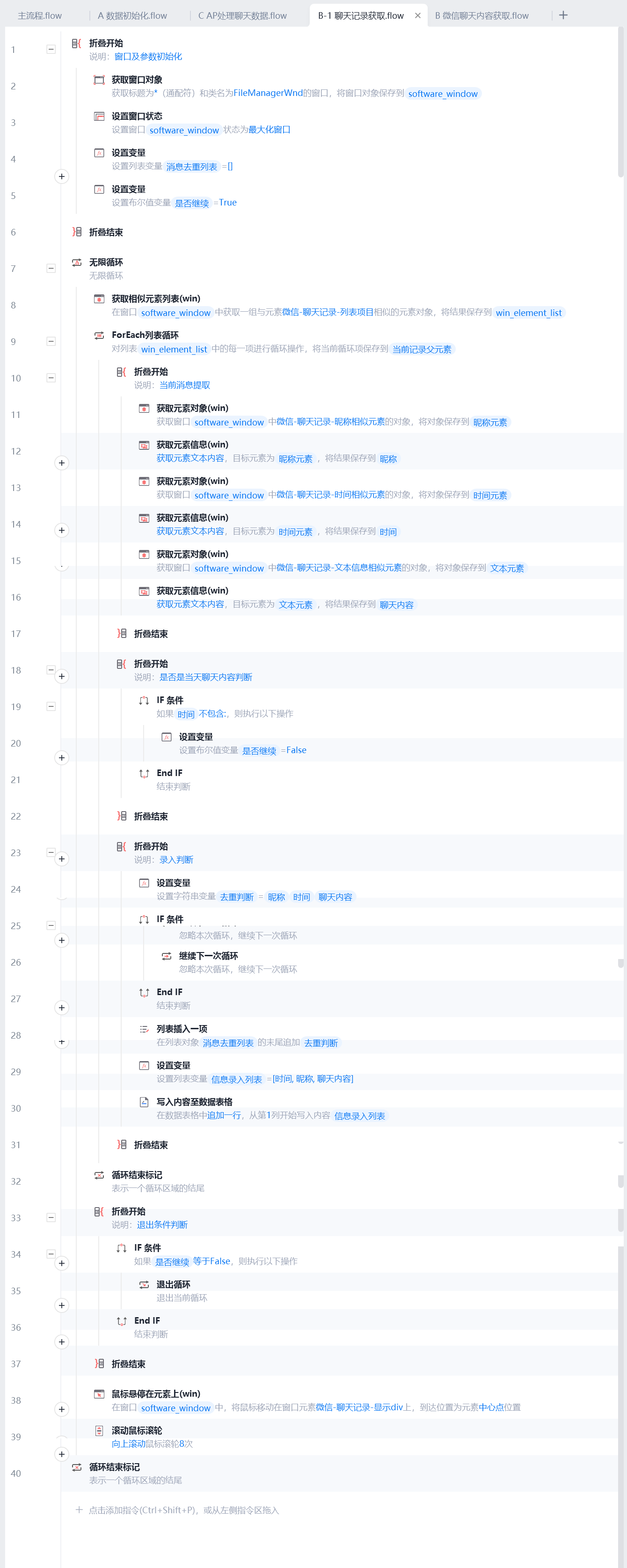 主流程负责模块化搭建, 主要包含A数据初始化,B微信聊天记录采集,C微信聊天记录数据处理三个流程