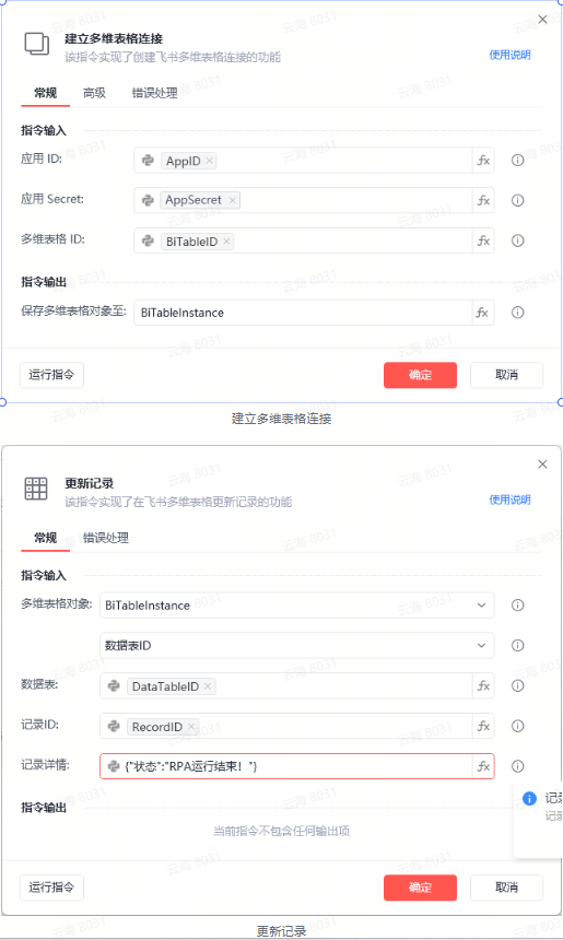然后如果需要回写在线表格,就在应用中需要的位置添加指令,飞书表格参照这两个指令,其他在线表格回写待研究