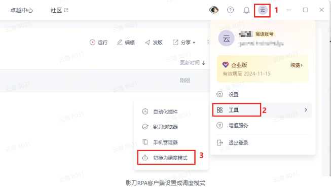 将应用发版之后,在PC上将影刀RPA客户端设置成调度模式。