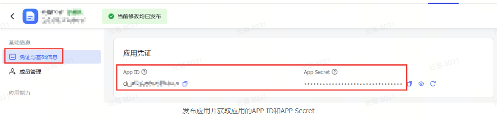打开飞书开发平台,创建企业自建应用,设置应用权限,发布启用,获取企业自建应用的APP ID和APP Secret。
