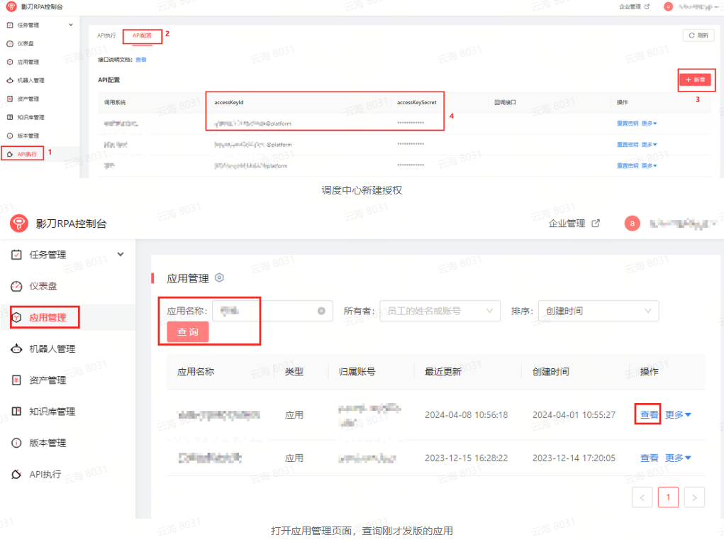 调度中心设置获取API调用影刀RPA的设置,获取调用的授权Access Key 和 Access Secret。