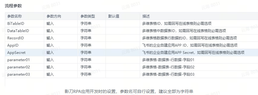 在应用主流程添加输入参数,此处以飞书多维表格为例,如果回写飞书多维表格,则多维表格ID,数据表ID,行数据记录ID以及APP ID和APP Secret均为必需,其他参数根据需要设定,开发好应用之后进行发版。如果如果多维表格和自建应用固定不变,这些其实可以作为影刀应用内定死的参数。