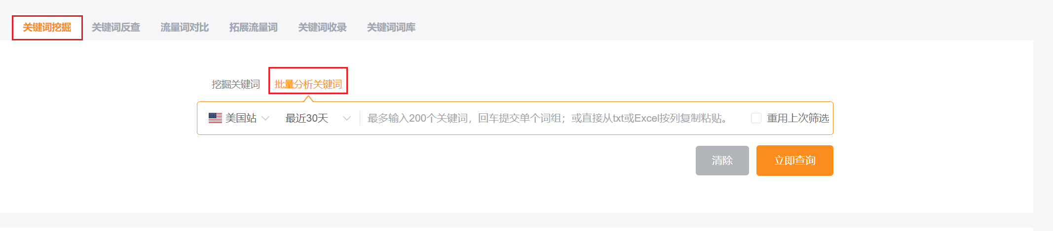 前置场景:在卖家精灵的关键词反查中搜索某一商品的ASIN值后查询会出现几十条关键词,需要提取查询结果的前20个关键词再到关键词挖掘中批量输入。