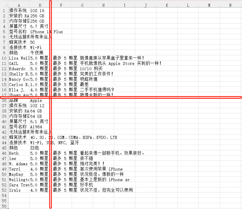 例如下图👇,18~35行是隐藏行,C~E列是隐藏列,而我们的需求是能够跳过这部分隐藏的数据,只读取excel显示的内容。
