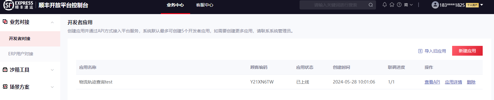 注意,新建应用在沙箱环境调试完成之后,需要拿他们顺丰官方给定的生产单号在沙箱环境中成功测试三次之后才能将应用运用到生产的实际环境中,具体可以参考https://open.sf-express.com/developSupport/195960。