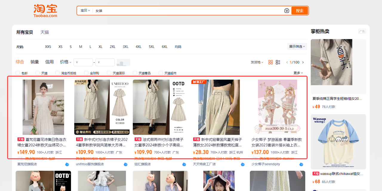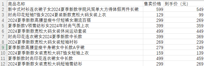 目标:统计女装分类前100个女装的“商品名称”,“售卖价格”和“到手价”