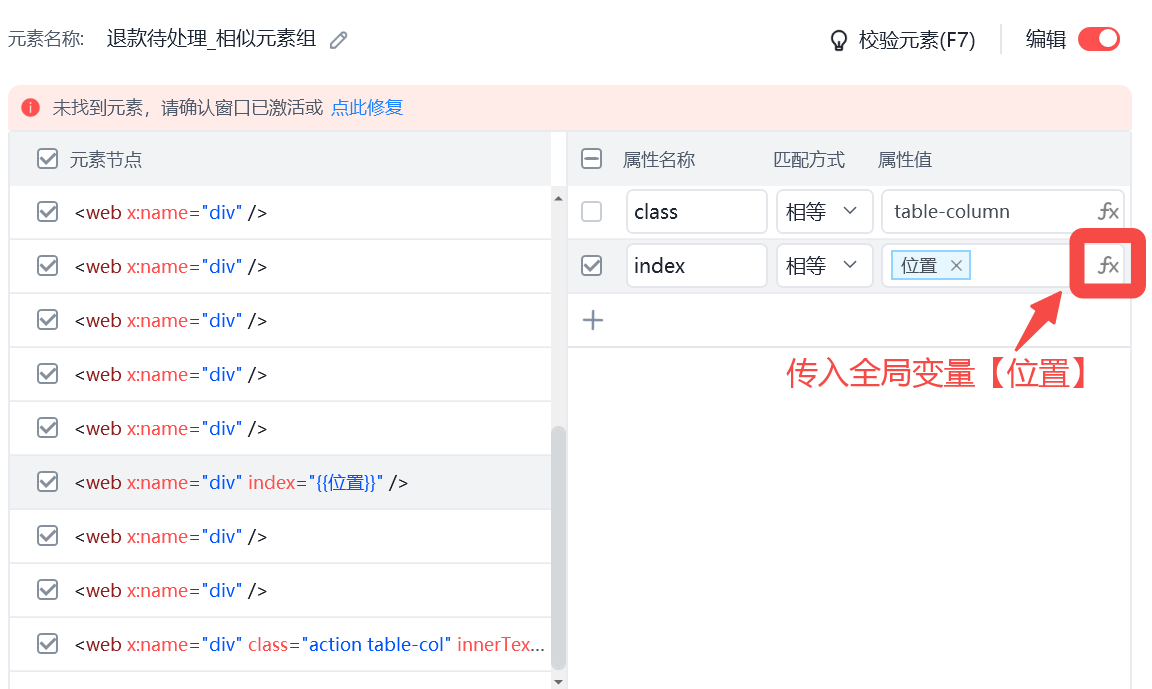 1. 编辑一个位置传参元素,使相似元素组中的元素能根据传入的【位置变量】来唯一定位
