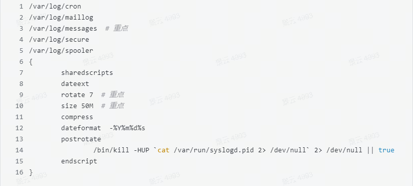 2.执行:vim /etc/logrotate.d/syslog,将内容修改为一下内容(如下图)