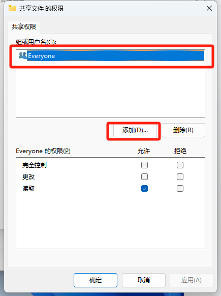点击添加,可添加对应访问的用户;Everyone则是全部人皆可访问此文件夹;