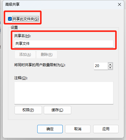 勾选上共享此文件夹;然后共享名可以更改为对应共享的名称,同时共享用户可以进行设置;