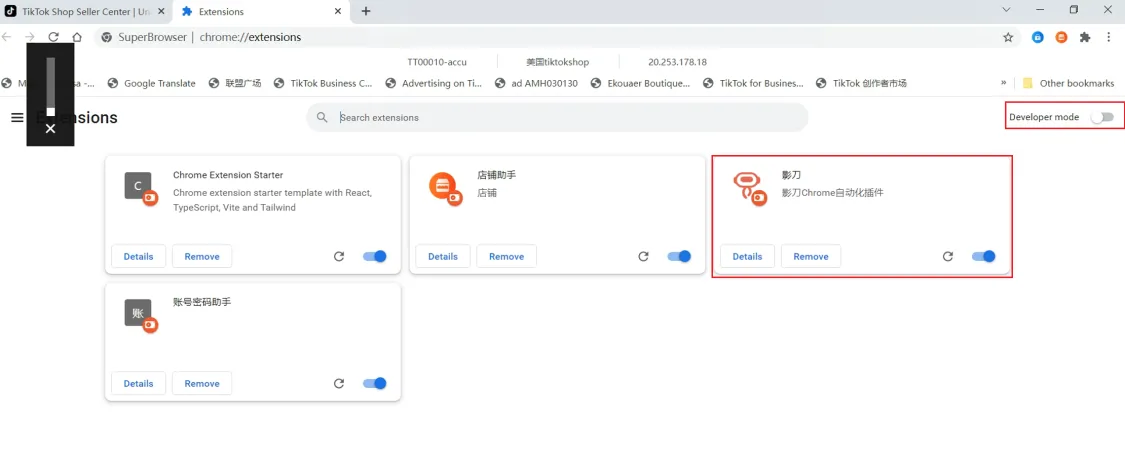 第一次尝试:因控制台没有插件管理中心( 私有化,安装不了生态中心的插件,只能单独安装),首先将ShadowBot.crx文件拖入至在子店铺的管理扩展程序中,有插件图标但启用不了,未生效。(该方法不能一次把所有子店铺都下载影刀插件。)