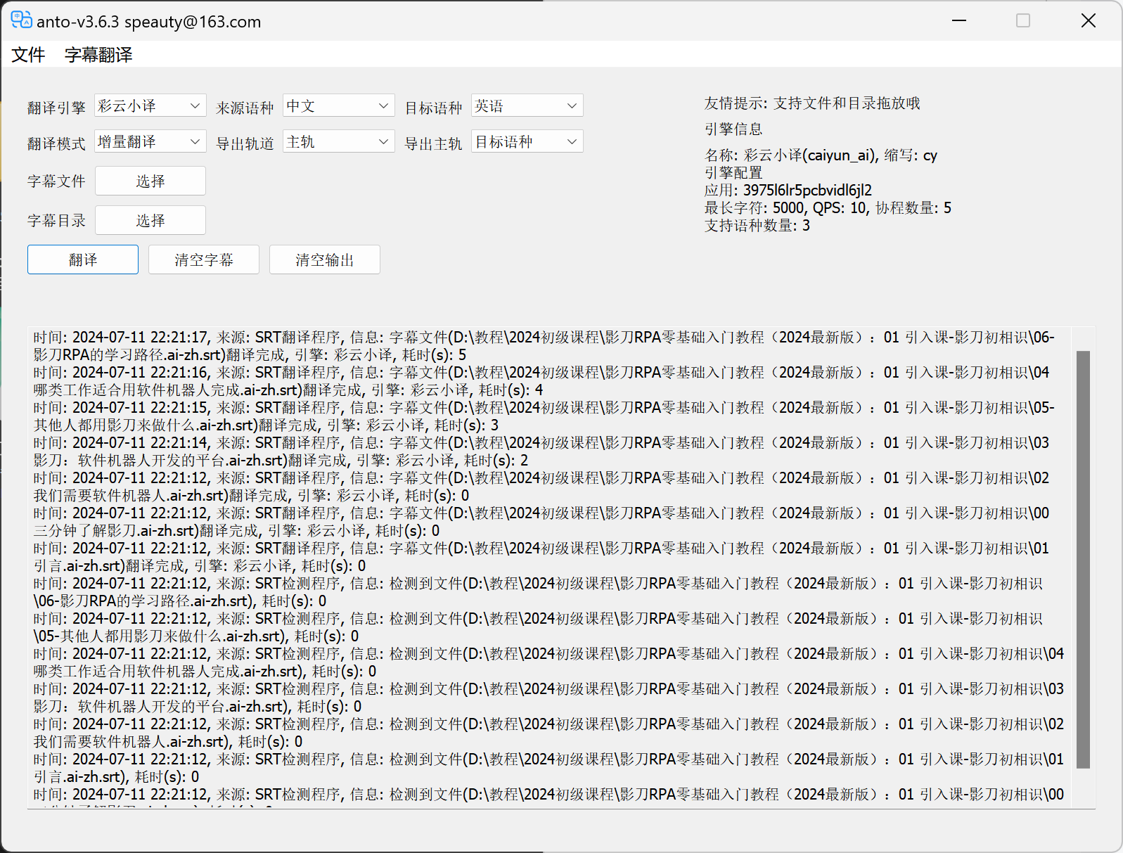 使用这款工具,把下载好的中文字幕(srt格式的字幕)文件批量翻译成英文字幕,可以使用免费引擎或自己的接口翻译字幕。