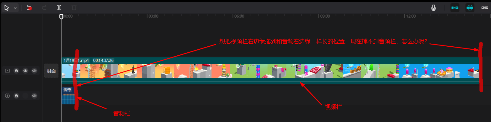 我最近在用剪映编辑视频,想实现一个功能:把拖入的视频时长和音频时长剪成一样就好。在电脑上操作很简单,只要把视频栏右边缘拖到音频段的右边缘,使两者保持一样长就好,剪映有吸附功能,当拖动到音频栏边缘时会自动对齐,但是我用影刀时找不到音频栏元素,用深度模式都捕获不到,根本看不到音频栏,请问遇到这种情况怎么整啊?