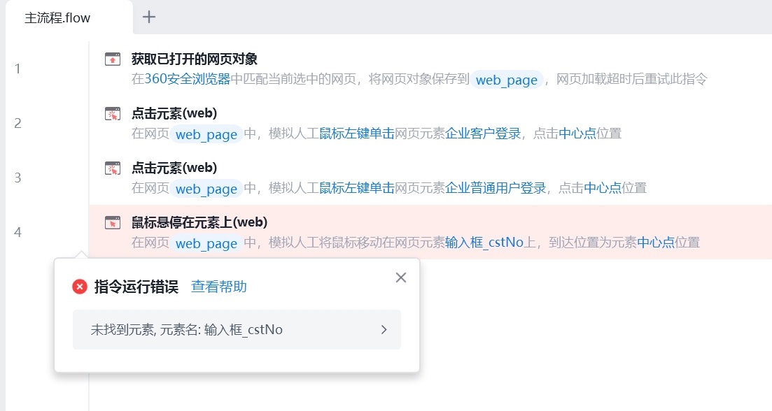 图片中第4步使用的是“鼠标悬停在元素上”指令,但是使用“点击元素”和“填写输入框”指令都不行,都是指令运行错误,找不到这个元素,不知道是什么原因,有大神帮忙解答下么?找不到这个元素,更别说下一步输入用户名账号了。。。。