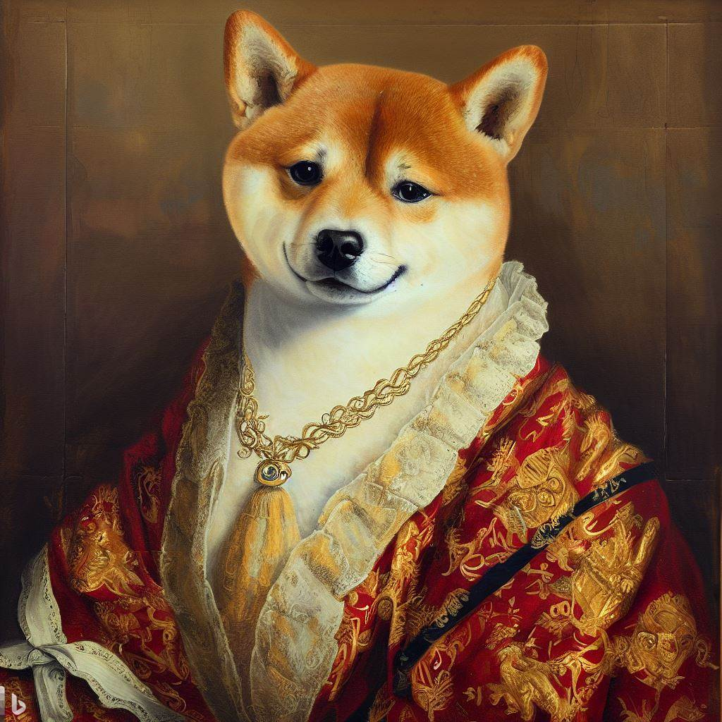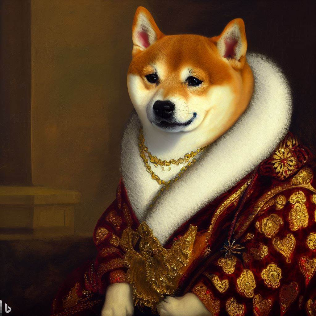 a Shiba Inu self-portrait, Dressed in royal finery in 1600s England, full body,oil painting, in the style of Hans Holbein the Younger