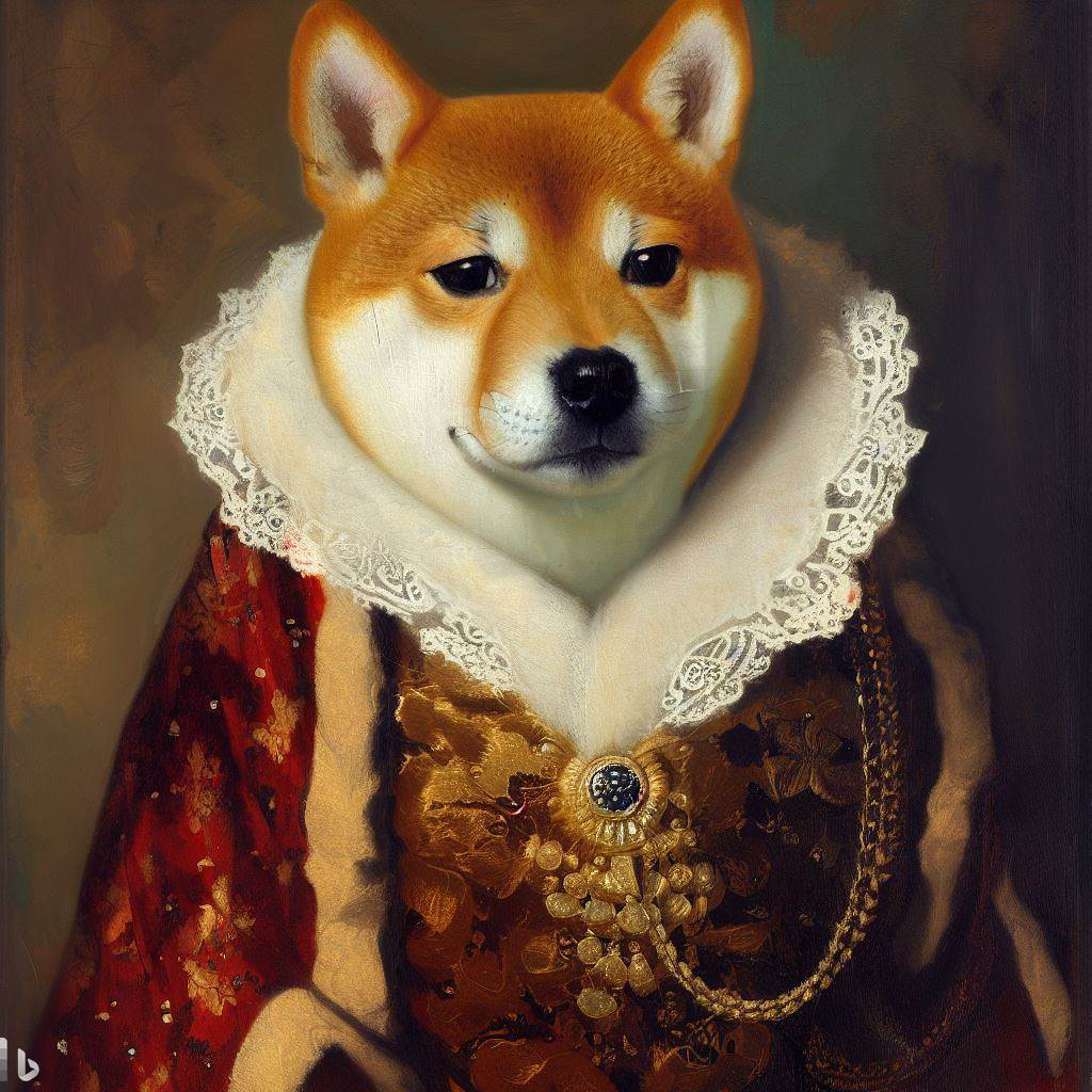 一幅柴犬自画像,身着17世纪英国皇家服饰,全身,油画,小汉斯·霍尔拜因风格