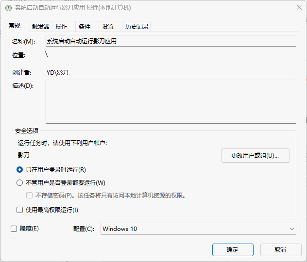 因为第一个任务的启动任务方式是:不管是否登录都运行,此时如果操作运行影刀,则没有ui(影刀底层运行,无法打开操作界面,需要在进程中关闭影刀进程后再重新启动影刀)