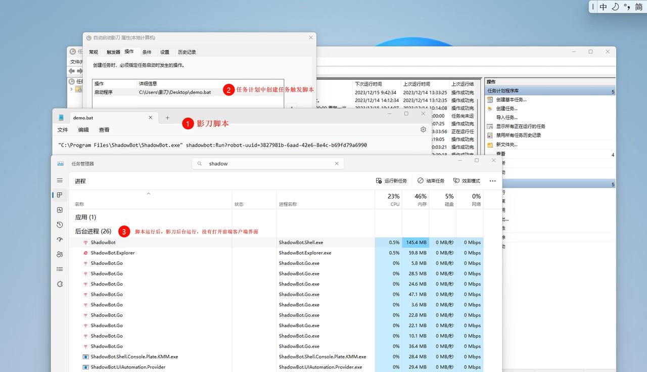 任务计划程序启动系统→系统启动后,影刀因为设置了开机自动启动,所以影刀也会随之启动