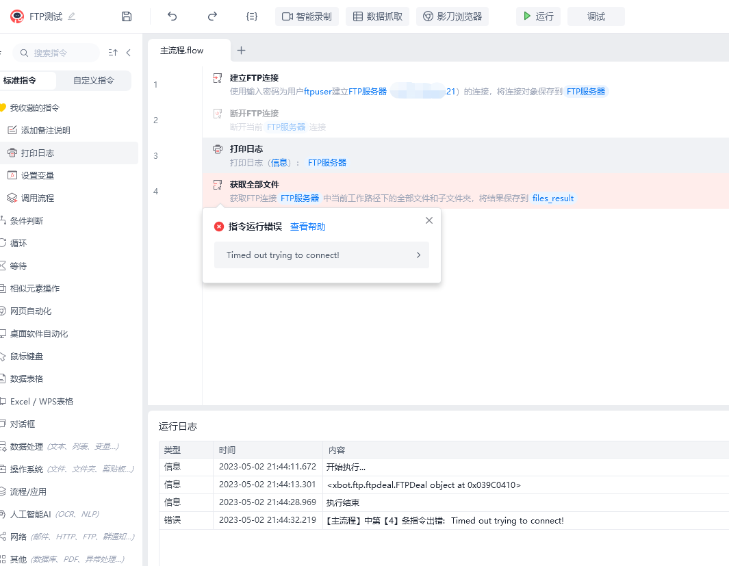ftp连接成功,但获取全部文件失败,Timed out trying to connect!尝试连接超时!FTP服务器是debian10系统,目前排除原因有用户名和密码错误,和端口被屏蔽