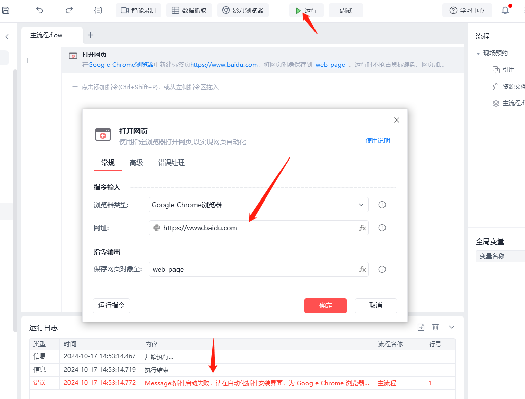 你好 请问网页自动化 打开网页 配置的浏览器类型是谷歌浏览器 版本 130.0.6723.59(正式版本) (64 位)网址是 https://www.baidu.com 扩展装的影刀1.1 但是点击运行的时候提示Message:插件启动失败,请在自动化插件安装界面,为 Google Chrome 浏览器重新安装影刀自动化扩展程序