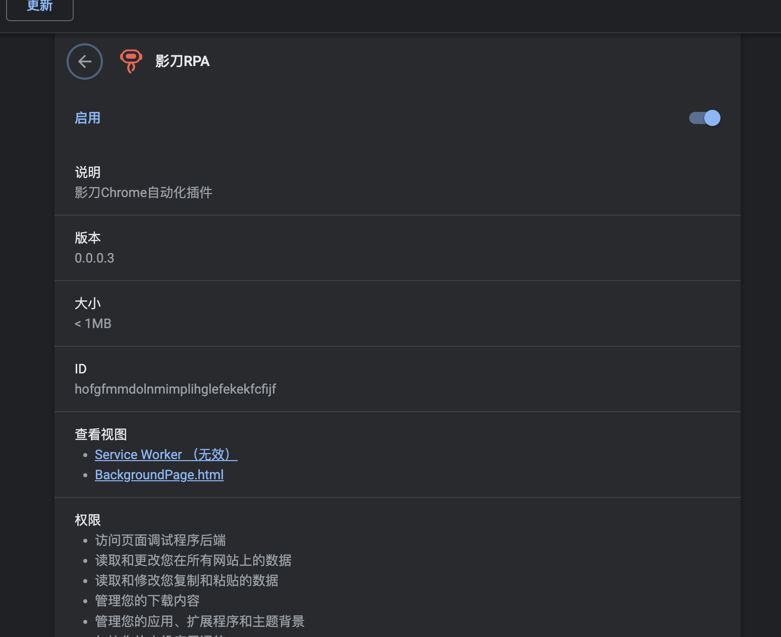 网页自动化,使用的是影刀浏览器,之前一直正常运行,突然不行了,提示插件没有启用,但是实际上插件是启用的,插件版本是0.0.0.3,如图