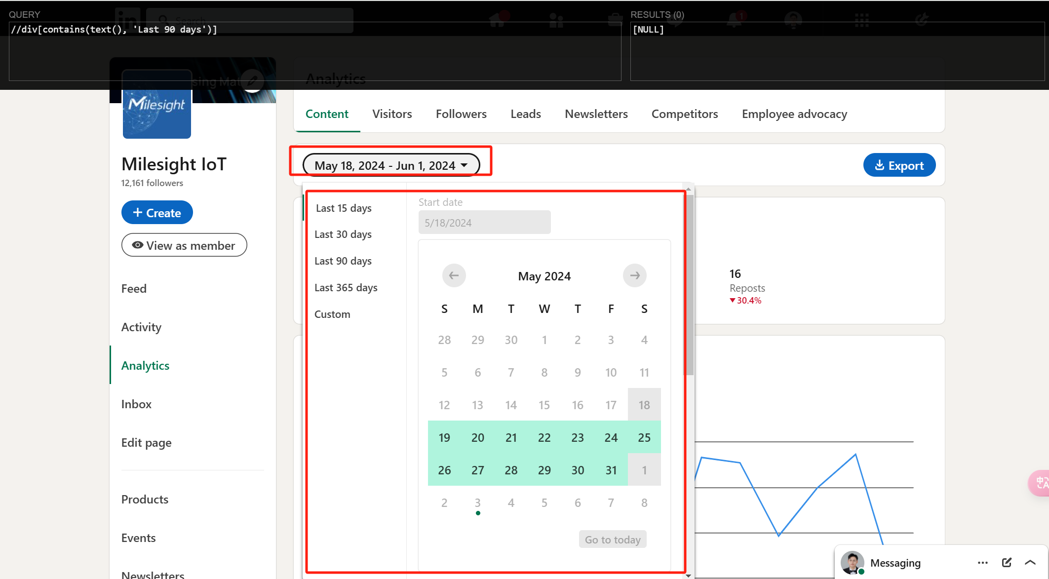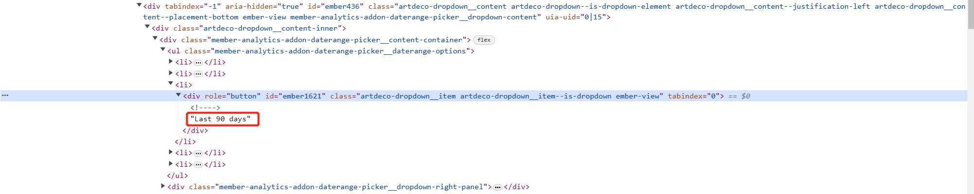 点击日期范围后,然后才出现悬浮框,我需要点击 Last 90 days. 用//div[contains(text(), 'Last 90 days')]怎么也定位不到这个按钮,提示未找到元素。请问该如何写呢? (PS: id的值会经常变)