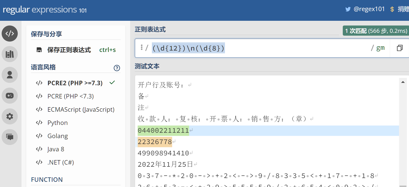 我在使用PDF发票文件提出指令时,要使用正则将 发票号 挑出来,在 https://regex101.com 中 测试的 正则 (\d{12})\n(\d{8}) 已能成功挑出发票号(如下图):