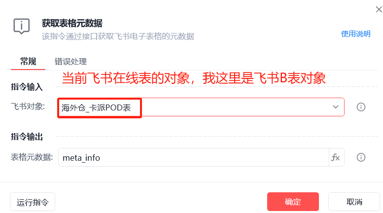 解决思路,用指令【获取表格元数据】,会返回一个字典(里面关于这个飞书在线表的啥数据都有),然后一步步循环遍历,得到想要的两个数据。