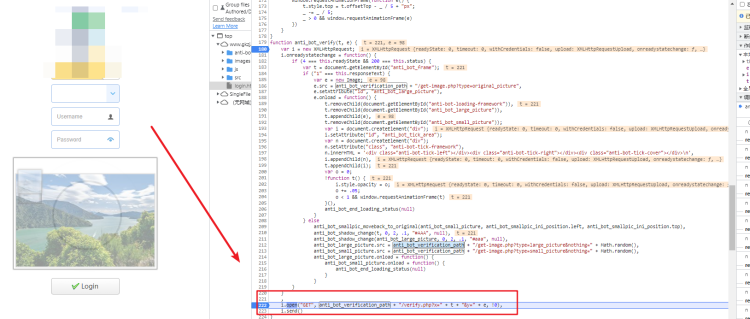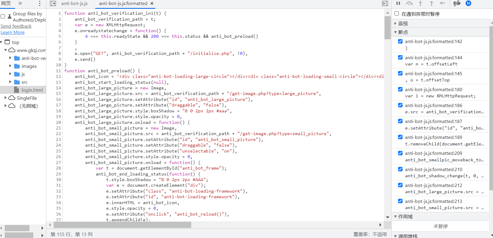 我们点击“启动器”选项发现这个验证码图片的js调用都指向了一个叫“anti-bot-js.js”js文件。