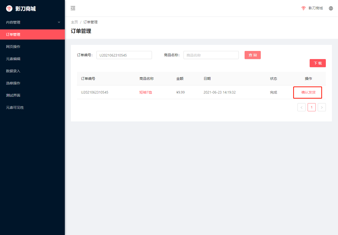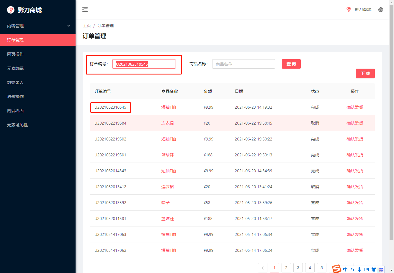 2. 查询第一条订单数据,如下图:3. 点击查询后,然后点击确认发货,在提示框中点击确定,此时该订单状态为发货成功,如下图: