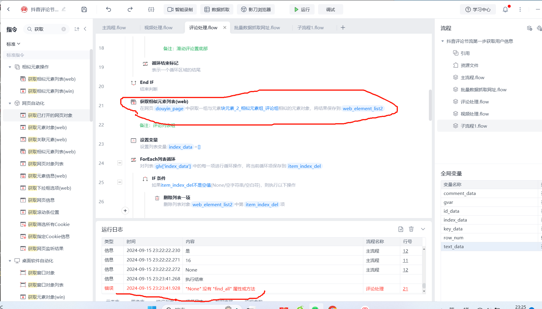 我获取抖音评论内容,获取相似元素列表的过程中,出现这个报错,以前运行过没问题,复制了一下这个自动化,在运行就报错了,请帮忙看看,最好能告知原理。