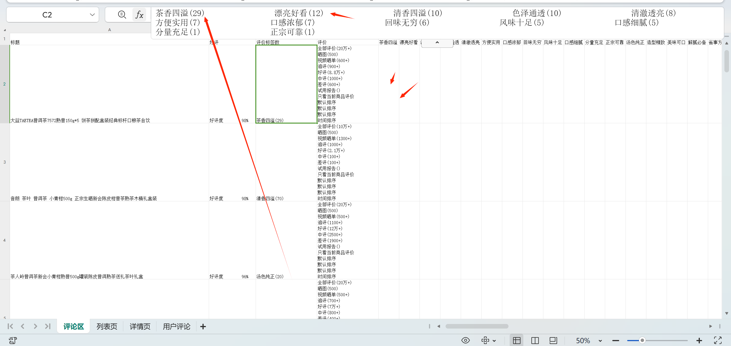 各位老师,我想将这个数据表格中的数据按照标签填入到后面的列中去,该怎么去写啊。例如这个茶香四溢(29)那么我在循环的时候,就要写到后面的列标签茶香四溢中去,然后继续去判断下一个漂亮好看(12),然后再填过去。第二行填完后,然后跳到第三行继续书写