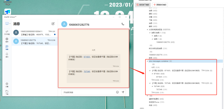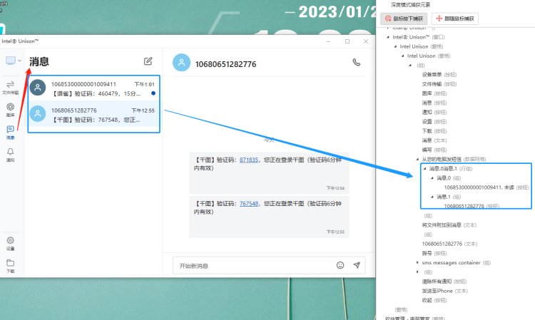 1.短信列表:元素结构中包括了短信的手机号码、是否已读,无法获取短信文本(点击后右边出现对应手机号的所有短信消息)