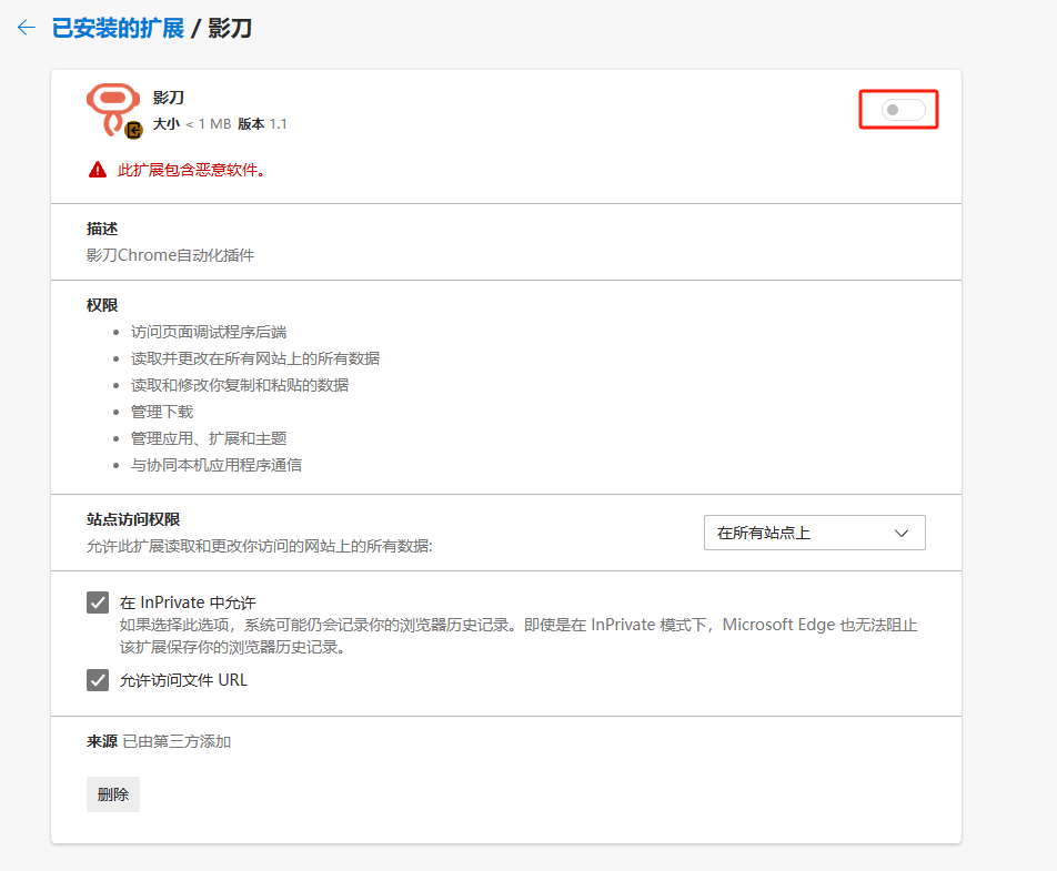 Microsoft Edge 中安装影刀插件后,在拓展页面显示关闭并提示 “