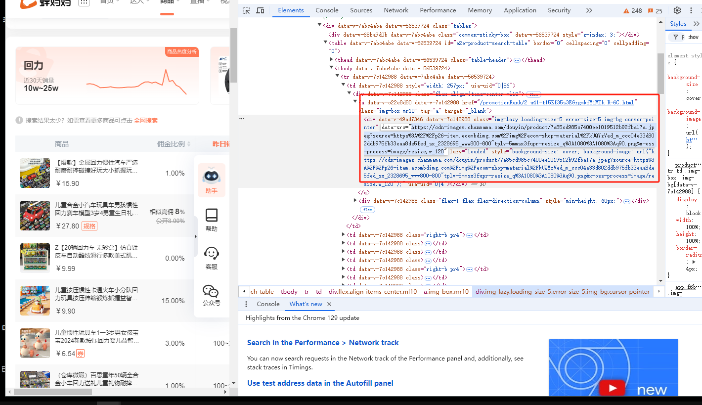 https://www.chanmama.com/promotionRank/?keyword=%E5%9B%9E%E5%8A%9B&has_jx_commission=0 蝉妈妈中的图片链接无法获取,使用获取属性和获取链接的方式都获取不到,但是后台有元素可以进去图片。