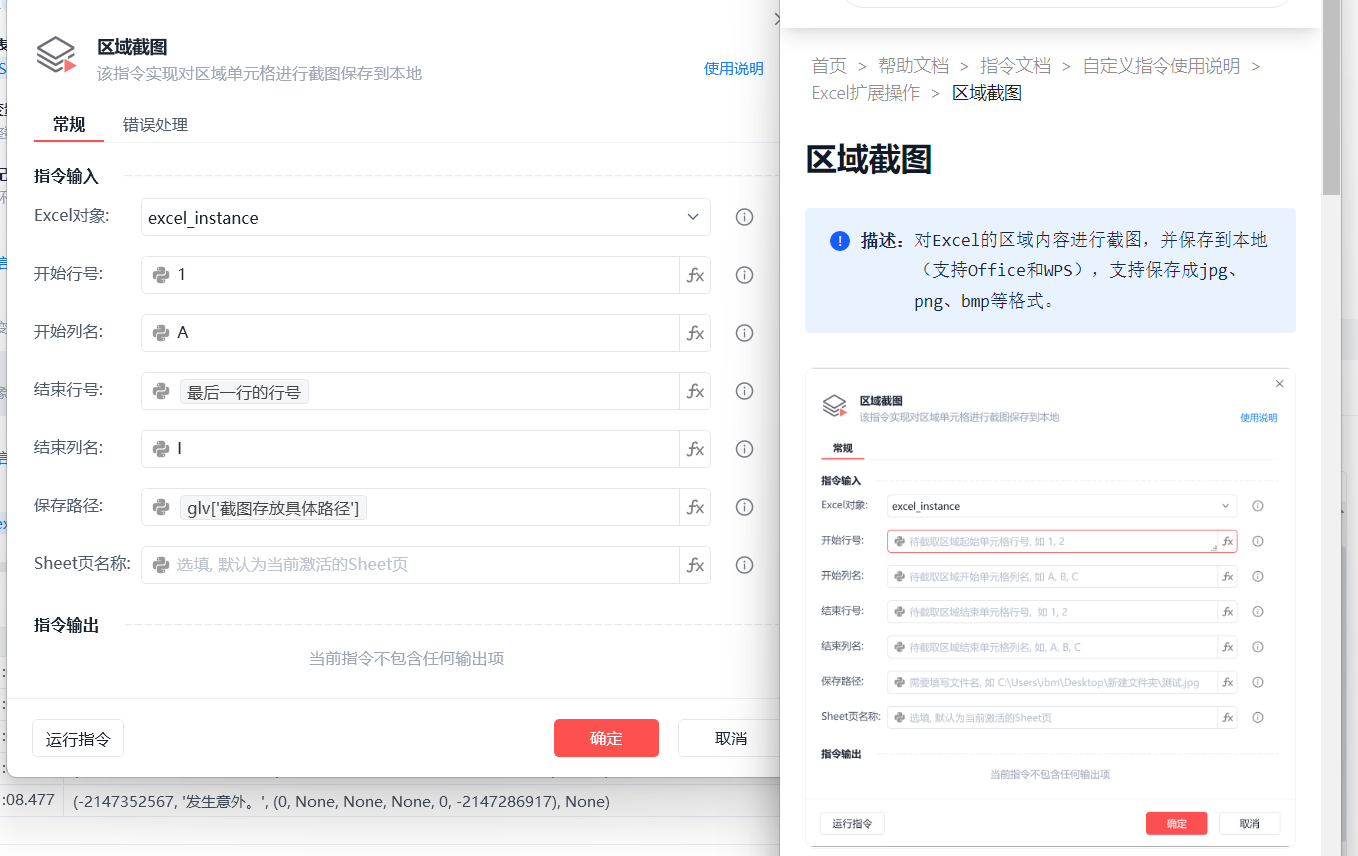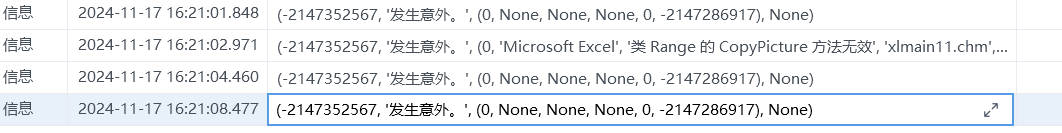 使用excel的区域截图报错。一直不停在excel文件上生成图片卡主,控制台报错信息:(-2147352567, '发生意外。', (0, None, None, None, 0, -2147286917), None)