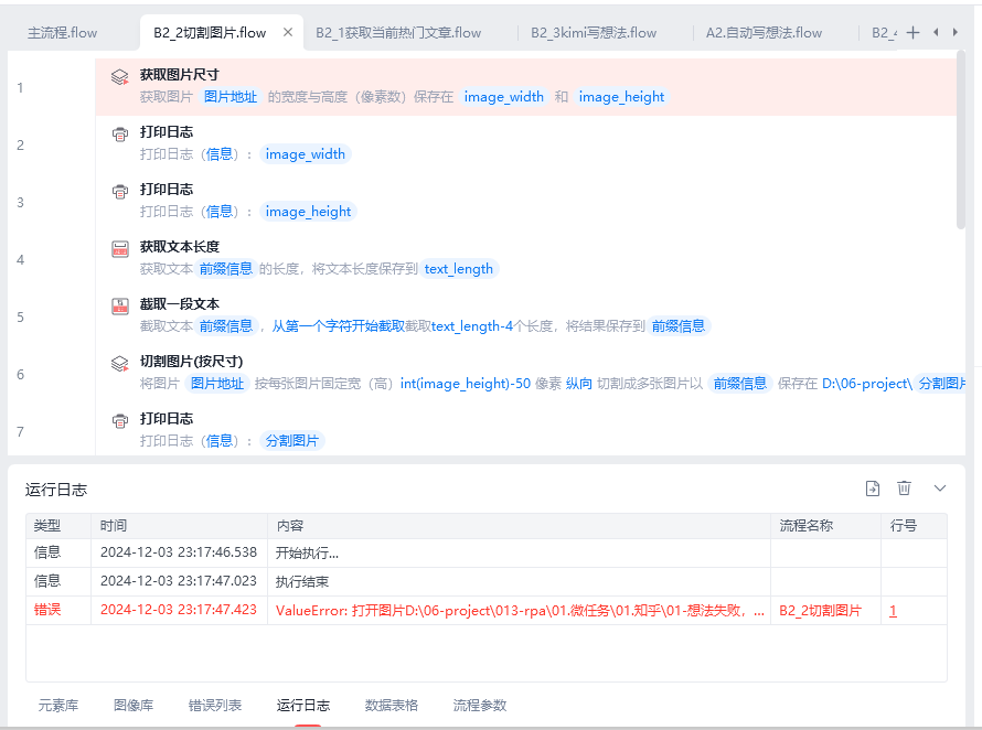 我在一个子流程中设置了流程参数:图像下载地址,方向为输出,保存从网上下载的图片。在另外一个子流程里也设置了一个和这个同名的流程参数,方向为输入,想从上一个流程中调用设置的输出参数,对保存的图片进行操作,但是提示错误,打开我设置的文件下图片失败,这是什么原因,请指教。这个里面的获取图片尺寸,图片地址,是上一个子流程B2_1里的流程参数,方向为输出,在B2_2里我也设置了一个同名称的流程参数,方向为输入,为什么没有调用B2_1过来。