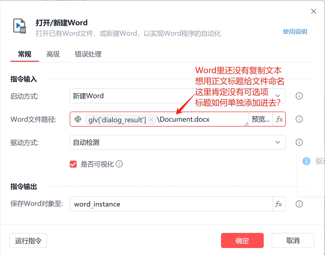 打开新建Word,路径想设置为全局变量\文件标题.docx,下一个指令才是复制文本,才有标题,这个路径咋设置,求其他办法