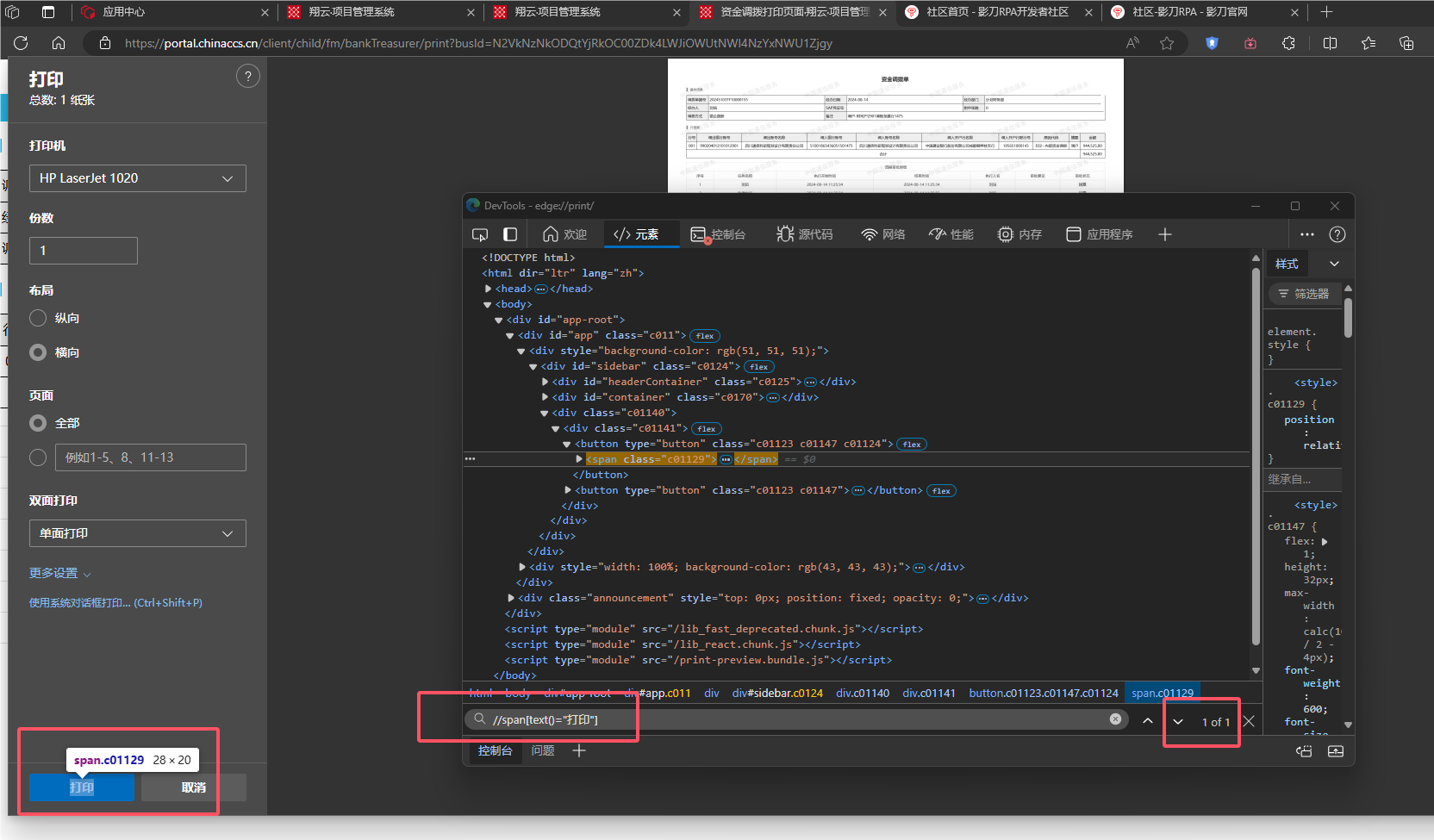 在页面中新弹出来的“打印”,获取到元素,点击元素,流程中没有反应,但又显示流程已完成