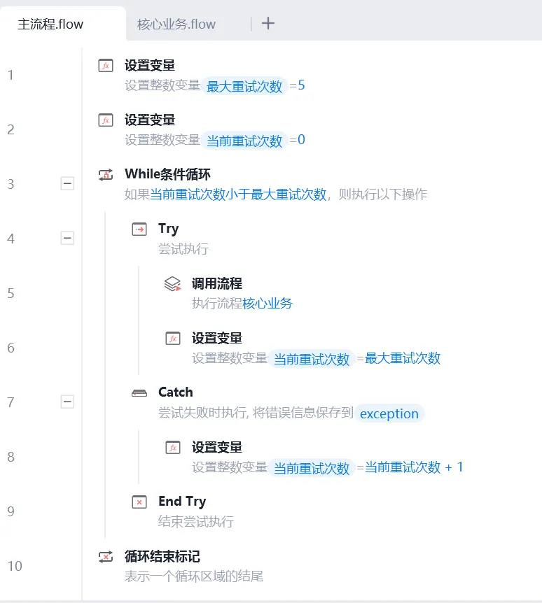 2. 编写业务代码达到重试效果,最大重试次数可根据实际场景自由配置,核心业务子流程中编写业务逻辑