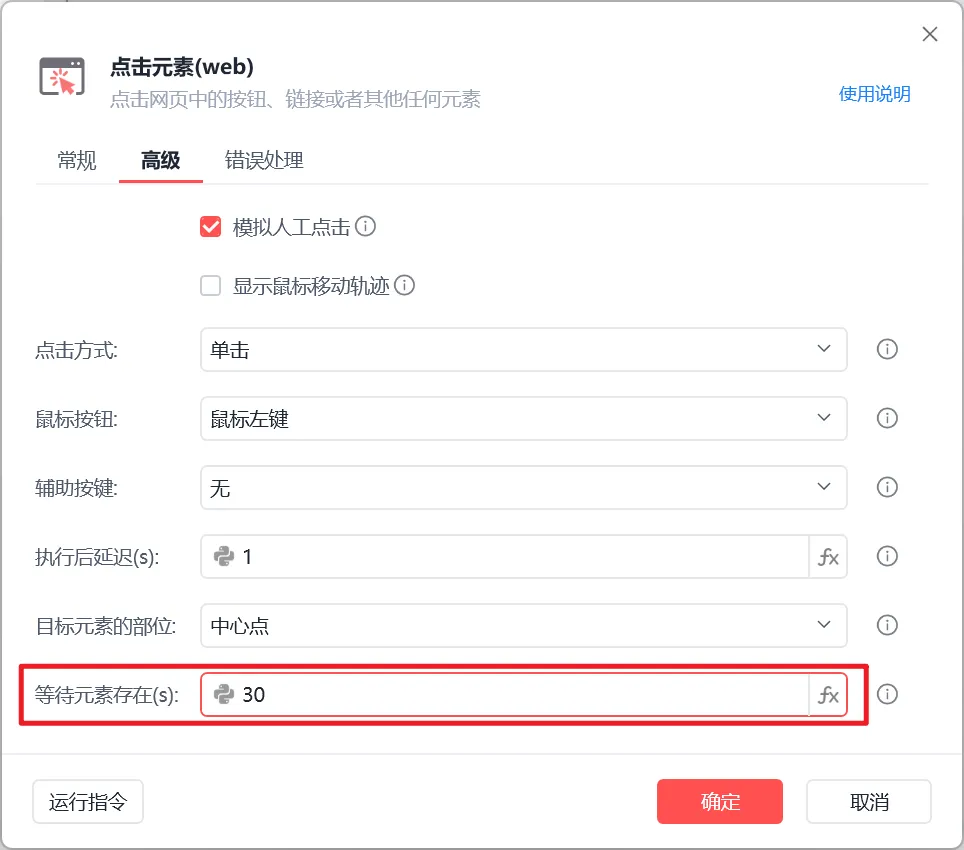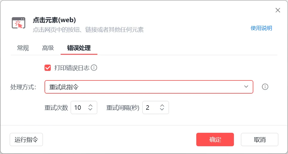 1、针对某条指令的重试,很多指令都提供了错误处理,选择重试此指令,结合实际情况配置重试次数和重试间隔
