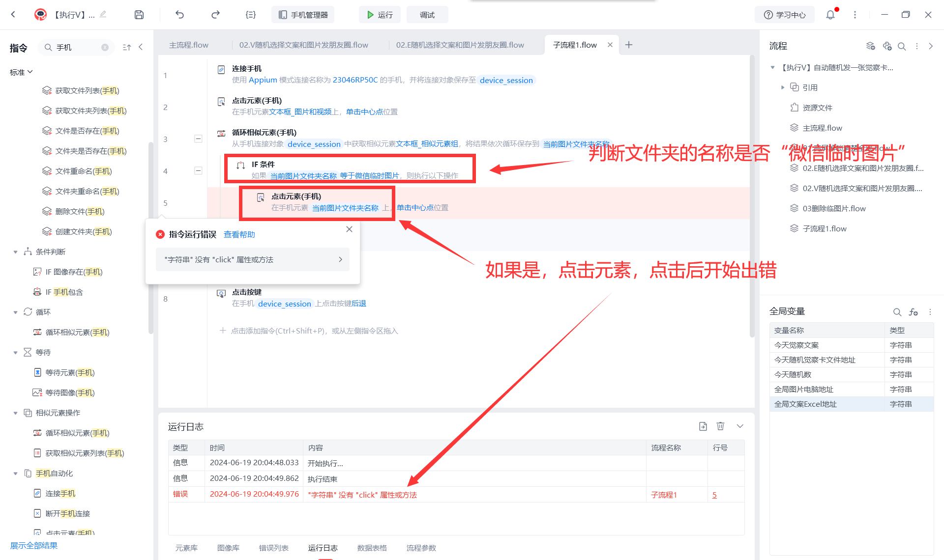 然后获取元数的“文本”,判断是否我需要的文件夹“微信临时图片”,然后点击,就开始出错。