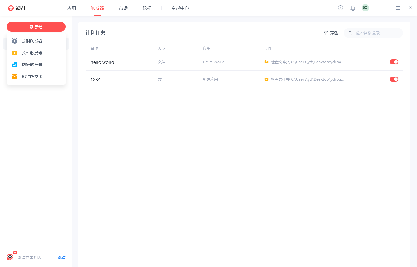 在影刀程序中,点击 触发器>新建>文件触发器