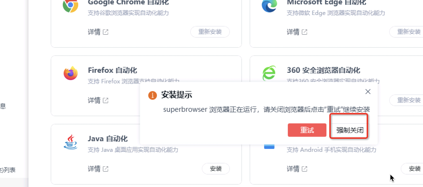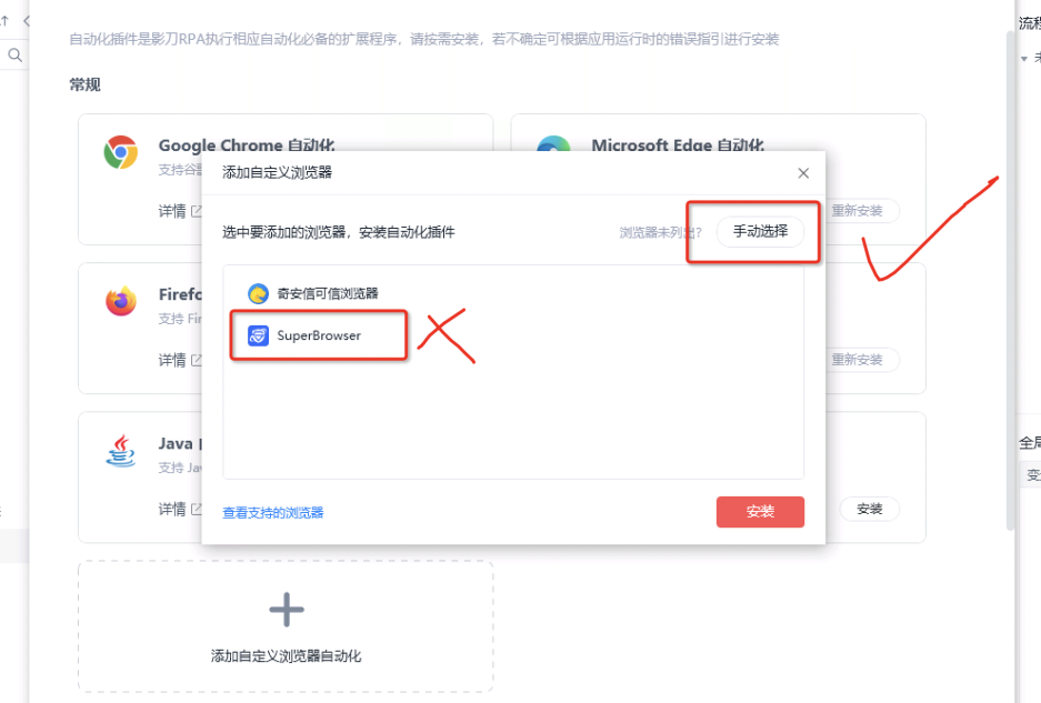 注意:此步骤是临时解决方案,5.10版本后只需执行一次自定义浏览器安装流程,无需手动查找superbrowser.exe的路径