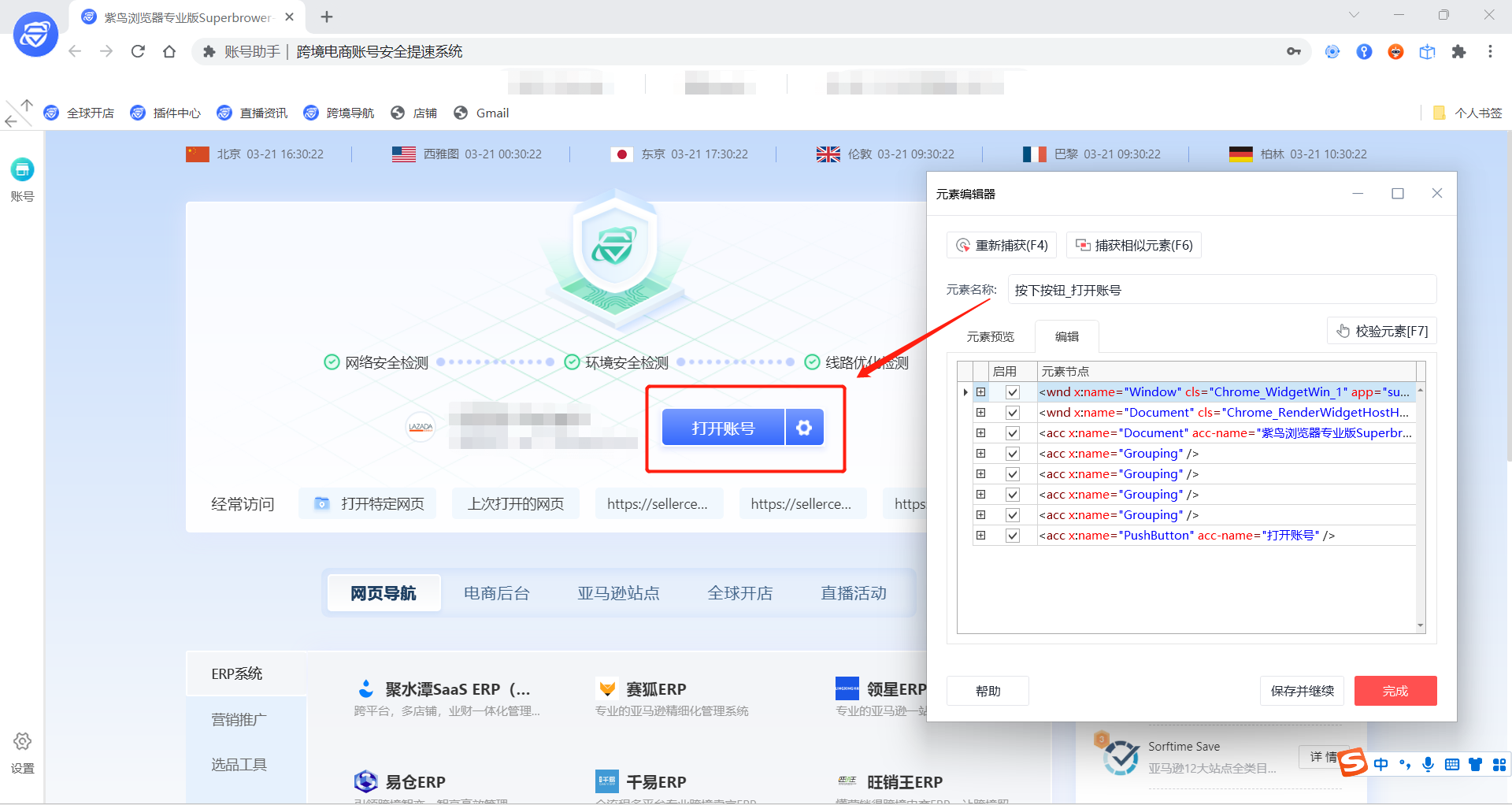 5.关闭紫鸟浏览器、影刀(进程全退了)之后重启,打开任意一个环境,打开店铺界面去捕获下元素,即可当成网页元素来处理。之后愉快的开启自动化办公吧!