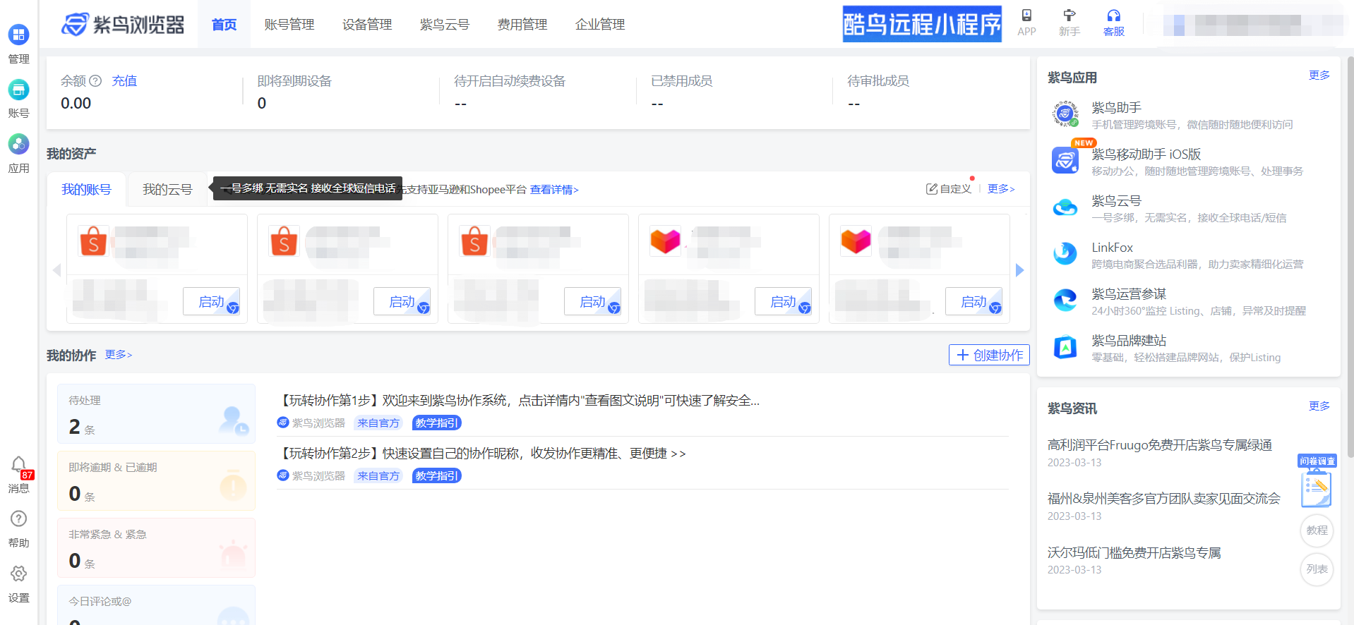用过紫鸟的都知道,紫鸟有2个窗口。如下图所示,左侧是工作台(以下简称大S浏览器),右侧才是我们想要的打开的跨境网页(简称小s浏览器)